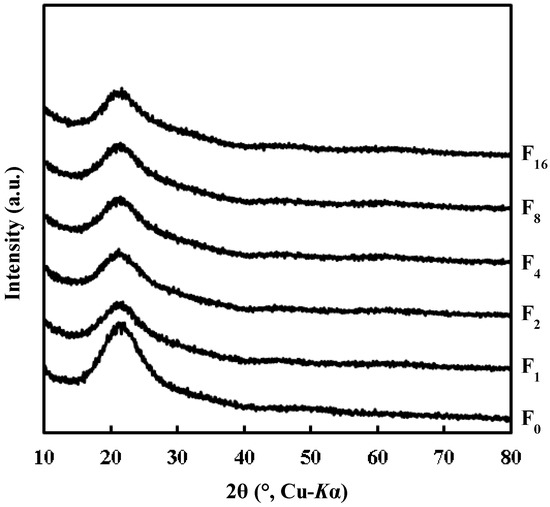 Figure 3 shows the XRD patterns of F0 and Fx. These XRD patterns indicate that the resultant thin films on the quartz glass substrate are amorphous because only a hollow band was observed in the 2θ range of 15–30°.