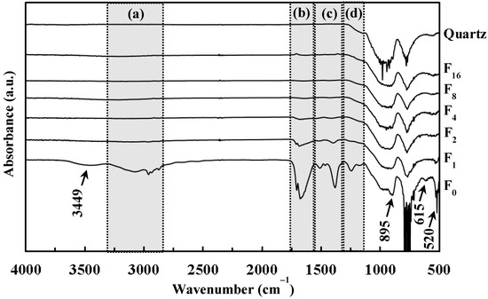 Figure 4 shows the FT-IR spectra of F0, F1, F2, F4, F8, F16, and the quartz glass substrate. The weak and broad absorption band observed at approximately 3449 cm−1 in the spectrum of F0 corresponds to chemisorbed water [17]. The region (a) involving weak and broad absorptions of 2875, 2934, 2960, and 3071 cm−1 correspond to the C–H stretching mode of CH2/CH3 groups [18,19,20]. The region (b) with peaks in the range 1675–1707 cm−1 are assignable to the C=O stretching mode [21]. Three peaks of 1382, 1467, and 1513 cm−1 observed in the region (c) are assignable to the C–H bending mode of CH2/CH3 groups [22,23,24]. Two peaks of 1246 and 1179 cm−1 in the region (d) represent the C–O stretching mode [23,25]. The peaks observed at 895, 615, and 520 cm−1 are assignable to the O–O stretching of side-on peroxo group bonded to Ti(IV) ion (Ti–O22−), to the Ti–O22− symmetric stretching mode, and to the Ti–O22− asymmetric stretching mode, respectively [26,27,28]. Additionally, the broad and weak peaks in the (b) and (c) region were observed from F1 and F2, while a weak peak at 520 cm−1 was observed from F1.
