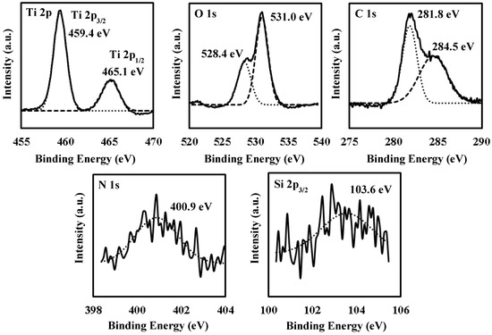 Figure 5 shows the XPS spectra of F4. Five binding energy ranges corresponding to the Ti 2p, O 1s, C 1s, N 1s, and Si 2p orbitals are presented. The two binding energies of 459.4 and 465.1 eV are assignable to Ti 2p3/2 and 2p1/2 orbital electrons, respectively, bonded to oxygen (Ti–O) [29,30]. The two binding energies of 528.4 and 531.0 eV can be assigned to the O 1s orbital electrons linked to titanium (O–Ti) and hydrogen (O–H) in the hydroxy group, respectively [31,32]. The two binding energies of 281.8 and 284.5 eV correspond to the C 1s orbital electrons associated with titanium (Ti–C, substitutional carbon of Titania) and carbon (C–C), respectively [33,34]. A binding energy of 400.9 eV corresponds to that of chemisorbed nitrogen [29,35]. The binding energy of 103.6 eV is assignable to the Si 2p orbital electrons bonded to oxygen (SiO2) [36]. The relative proportions of the five elements, Ti, O, C, N, and Si calculated from each peak area and sensitivity are 12.0, 53.8, 32.5, 0.9, and 0.9%, respectively. The calculated O/Ti ratio of the Ti–O bond, to which a binding energy of 528.4 eV can be assigned, is approximately 1.53.