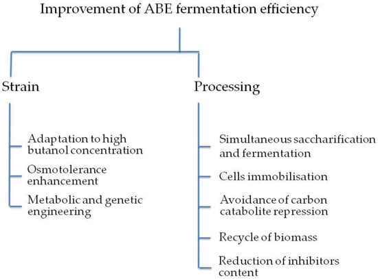 In conventional clostridial fermentation processes, butanol yields of 16–17 g/L can be achieved using the best native bacteria. Therefore, one of the main goals of research has been the development of strains to enhance the butanol yield (Figure 1). Research has focused on: (i) the selection of the bacterial strain, (ii) use of less expensive carbon sources to produce butanol, (iii) metabolic engineering strategies, (iv) the process development and (v) biobutanol recovery techniques.