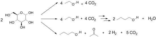 Clostridium spp. bacteria are able to produce organic compounds, acids, alcohols and other solvents, by fermenting a wide spectrum of carbohydrates [,,,,,]. However, of the saccharolytic and mesophilic species capable of butyrate production, only a few are able to produce butanol with high fermentation yields: Clostridium acetobutylicum, C. aurantibutylicum, C. beijerinckii, and C. tetanomorphum [,,,].