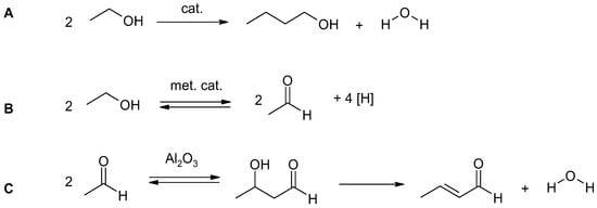 Other tests have been conducted using a two-zone reactor. In a study by Dziugan et al. [,], the first zone of the reactor was filled with 8%Ni/Al2O3 and the second with 5%Pd–8%Fe/Al2O3. Metals such as Ni and Pd can act as hydrogen transfer catalysts, promoting both the dehydrogenation of ethanol to aldehydes and hydrogenation of the acetaldehyde condensates to heavier alcohols []. Metal oxides supporting Ni and Pd are dehydration catalysts []. Separate studies have used bimetallic palladium-iron catalyst, because of its particularly high activity in hydrogen transfer reactions [,,]. The use of a two-zone reactor contributed to improve the H/C ratio in the liquid fuel biocomponent. The reaction is summarized in Figure 4.