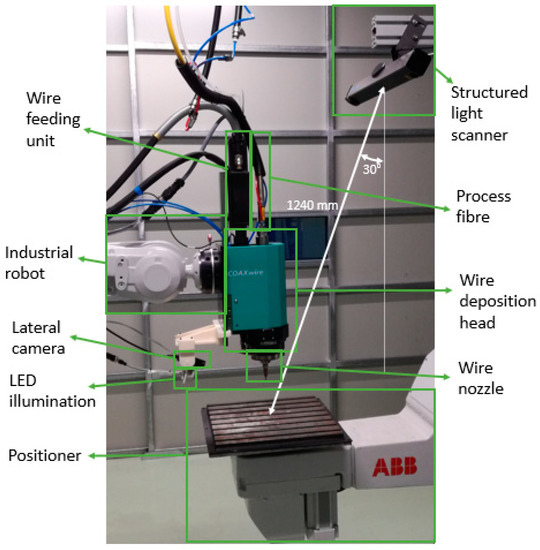 Experimental setup of the laser metal wire deposition (LMWD) robotic cell.
