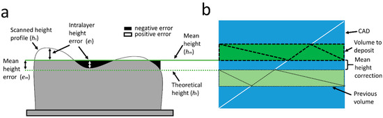 A representation of the height deviation of a layer is illustrated in Figure 2a. When a layer is to be deposited, the approximate growth of the layer is known, hence the height that the part should reach after deposition is referred to as theoretical height, . However, the growth of the part will not necessarily match the theoretical height, so there is an error between the scanned layer height profile, , and the theoretical height (Equation (2)).