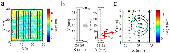 Local height control based on scanned height profile. (a) Scanned point cloud and deposition trajectory; (b) Discretization step in the trajectory. Left: consecutive points before discretization. Right: consecutive points after discretization; (c) Intra-layer local height control strategy.