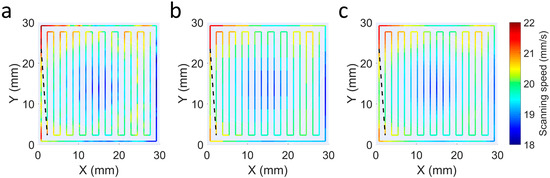 User-defined values and also influence performance of the control. Figure 5 shows the deposition trajectories calculated with various combinations of these parameters. In Figure 5a, small and values are chosen, resulting in a large number of points on the trajectory and the deviations being calculated with very close scan points. As a result, more localized height variations can be corrected, but the velocity changes are also more pronounced. On the other hand, in Figure 5b, a higher value of which is also significantly higher than is selected. This results in fewer points in the trajectories and very discrete and sudden speed changes. Finally, the parameters in Figure 5c were considered as adequate for this work, in which a relatively small value of and a slightly larger value of are used. In this way, moderately small deviations can corrected with progressively changing speeds. Although a lower value of can introduced, the improvement may not be relevant and the calculation time of the trajectories may increase considerably.