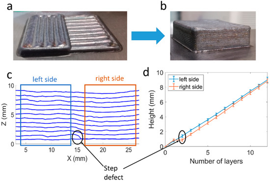 In the first test (Figure 7a), a step-type defect was simulated. After an initial complete layer deposition, only half of the section was deposited in the second layer. In Figure 7b, the part can be seen after the correction of the step defect, resulting again in a flat surface. Figure 7c shows the height profiles of the part calculated for each layer obtained from the scans, and the provoked step defect. Finally, in Figure 7d, the evolution of the height on both sides of the part is illustrated. The step defect induced in the second layer can be seen, which results in a difference in height between the two sides of the section. This difference in height decreases along the layers until it becomes negligible in the 12th layer.