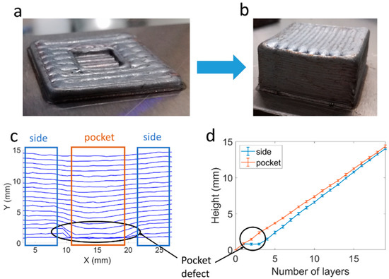 In the second demonstrator (Figure 8a), a pocket-shaped defect was generated. Again, the result of scanning speed control is shown in Figure 8b, in which after a certain number of layers a flat deposition was restored. The pocket defect, consisting of two layers of difference with respect to the top layer height, was produced deliberately (Figure 8c). The evolution of the height for the pocket and for the external zone is reflected in Figure 8d. In this case, the height difference in the third layer was larger, so it was not until the 19th layer that the height of the entire layer was almost levelled.