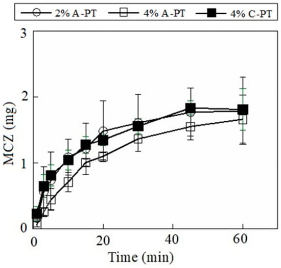 Release profiles of miconazole (MCZ) from film dosage forms prepared using pectin. Each result represents the mean and standard deviation of three determinations.