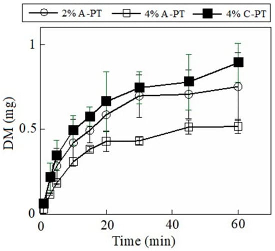 The drug incorporated in the FD dissolved when the dosage form immersed in the test medium. Our results showed that 1.1 ± 0.3 mg of MCZ dissolved at 10 min from the FD prepared using 2% A-PT, and 1.6 ± 0.4 mg of MCZ dissolved at 30 min (Figure 4). The dissolution rate of MCZ decreased when 4% A-PT was used as the film base solution. Furthermore, the drug release profile from FDs prepared using 4% C-PT was similar that of FDs prepared using 2% A-PT. In addition, we observed that the disintegration profile of the FD affected the rate of drug release from the dosage forms containing DM. Further, 0.42 ± 0.14 mg of DM dissolved by 10 min from the FD prepared using 2% A-PT, and approximately 90% (0.70 mg) of the total DM incorporated in the FD dissolved after 30 min (Figure 5). DM showed a slow rate of dissolution from the FDs prepared using 4% A-PT; 0.43 ± 0.02 mg of DM had dissolved by 30 min from the FDs prepared using 4% A-PT. FDs prepared using 2% A-PT and 4% C-PT as the film base solution showed similar drug release profiles. The disintegration profiles of the FDs differed depending on the type of pectin used as the film base. Moreover, erosion of the FDs affected the dissolution rate, particularly of the water-insoluble model drug DM, from the dosage forms.