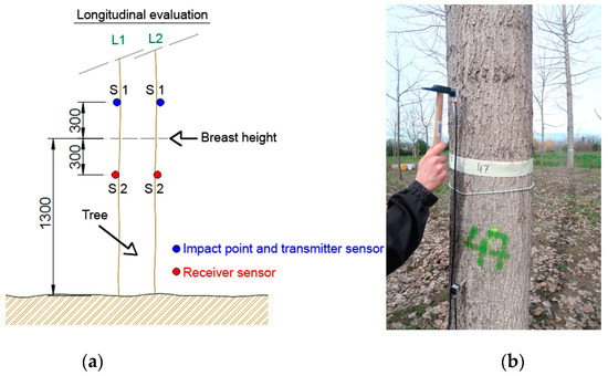 Time of Flight (ToF) inspection on the standing trees along directions L1 (N) and L2 (S). (a) Experimental setup; (b) Picture of a field test. Distances in mm.