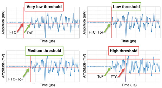 As it is obvious, the determination of the arrival time (ToF) of the signals x1 (t) and x2 (t) is a key aspect for the calculation of the propagation velocity. The traditional and easier method for determining the propagation velocity (threshold method) consists of establishing an amplitude value (threshold). Thus, the ToF, t1 or t2, is considered to be the first threshold crossing (FTC). However, this method is highly dependent on the chosen threshold. As shown in Figure 2, if the threshold is low, FTC will be lower than ToF, due to the presence of electrical noise. Otherwise, if the threshold is high, FTC will be greater than the ToF. Ideally, as it is deduced from Figure 2, FTC = ToF should be met.
