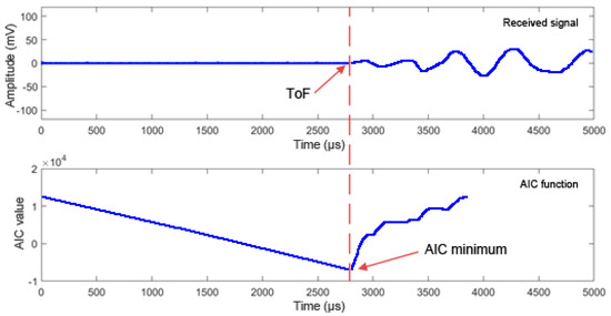 As an alternative to the threshold method, the Akaike Information Criterion (AIC) has been applied in this paper. This method was developed in 1971 [35,36] and is especially suitable for transient signals [27,28,29]. The AIC can efficiently separate different events into a temporary signal, or otherwise detect the arrival time of the signal [27,28,29]. The method is based on the following argument—on the left of the arrival time, the signal is basically noise, which is characterized by high entropy. However, on the right of the arrival time, the noise has a low contribution, and therefore, the signal has a low entropy. That is, just at the ToF there is a strong entropy difference between the left and right portions of the signal.