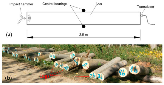 Resonance inspection on logs; the experimental setup (a); and image of the inspected logs (b).