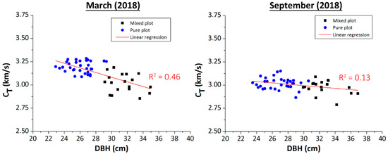 Propagation velocity versus DBH (diameter at breast height) for Plantation 1. Measurements during winter (March, 2018) and summer (September, 2018).