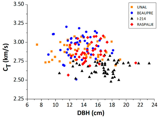 The average values of propagation velocity, obtained for each tree, using the Akaike method, versus the diameter of the tree measured at breast height (DBH), are shown in Figure 6. Likewise, a linear regression of CT versus DBH is included. Table 2 summarizes the average values and the standard deviation of CT and DBH for each type of plantation and season. They show that the season of the year in which the inspection of the standing trees was made, had a slight influence on the propagation velocity (the difference falls within the confidence intervals of the measures). This was due to the influence of the sap status. When the sap was stopped (winter season), velocity values were higher than when the sap was flowing (summer season). The greater presence of sap in summer, and therefore, greater humidity of the wood, caused a slight decrease of the propagation velocity [11,22].