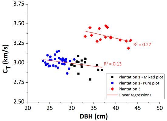 Figure 8 shows the propagation velocity versus DBH for the trees of Plantation 3. Superimposed are the results of Plantation 1 (same clone, but different sand, and age). Table 4 summarizes the average DBH and propagation velocity values for each plantation. As it can be seen, there is a remarkable difference in the propagation velocity and DBH, between both plantations. In both cases, a similar negative relation between CT and DBH was observed. The DBH of Plantation 3 was 41.2% and 16.8% higher than the DBH of the pure and mixed plots of Plantation 1, respectively. Moreover, the propagation velocity of Plantation 3 was 11.5% higher than the mean velocity of Plantation 1 (the average velocity between the mixed and pure plots). These were basically due to three factors: (1) Plantation 3 was five years older than Plantation 1, which produced more adult wood and, therefore, with greater stiffness; (2) the stocking was higher in Plantation 1 than in Plantation 3, which entailed a greater competition among trees; and (3) Plantation 3 was located in a more extreme climate, with lower temperatures and lower water availability, which also produced a higher wood stiffness.