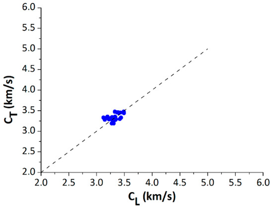Finally, as a validation of the technique, Figure 9 shows a comparison of the propagation velocity of standing trees, obtained by using the ToF method (CT) and the propagation velocity measured on the logs, by means of the resonance method (CL). It can be observed that the most of the points are grouped near the 45° line, i.e., CT ≅ CL, demonstrating a high homogeneity of the wood, due to the good management of the plantation (silvicultural practices). Average value of the CT and the CL was 3.34 and 3.32 km/s, respectively. It should be taken into account that the ToF method, and therefore, the CT, basically evaluates the stiffness of the outer wood, while the resonance method, CL, evaluates the wood of the entire log. Greater deviations between the CT and CL have been observed for other species, such as pine [20]. However, in the case of poplar, due to the low thickness of the bark, and the homogeneity of the wood, lower deviations between the inspection in trees and logs were shown by this study, i.e., CT ≅ CL.