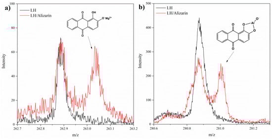 The TOF-SIMS technique was employed to investigate the interactions between the matrix and the alizarin molecules. It was expected that alizarin would be stabilized in the LH matrix by ionic interactions with Mg2+ and/or Al3+ ions, and that such interactions would be revealed by the emission of characteristic ions from the LH/alizarin. This was confirmed by the presence of a C14H7O4Mg+ ion peak at m/z 263 in the TOF-SIMS spectrum of LH/Alizarin (Figure 1a). TOF-SIMS analysis was also used to investigate the formation of possible Al-alizarin complex ions. The presence of C14H7O5Al ions (m/z 281) may be ascribed to the fragmentation of complexes of alizarin with aluminum (Figure 1b). This is supported by the results of a study by Soubayrol et al. [24], in which it was found using NMR that alizarin formed a complex with Al3+ in both aqueous and methanolic solutions of sodium hydroxide. Complexes of alizarin have been reported with metals such as Ca or Mg [25]. However, the formation of complexes of organic chromophores with mixed oxides in LH may be hindered by steric limitations. This is due to the fact that aluminum-magnesium hydroxycarbonate consists of irregular plate layers. Alizarin molecules therefore have to be properly oriented towards the LH layers, in order to interact effectively with the Mg2+ and/or Al3+ ions. In traditional alizarin lakes, aluminum forms part of a chelate ring with the 9-carboxyl and 1-hydroxyl groups of alizarin, while a divalent cation (usually calcium) is bound as an ion [8]. However, in the current study, the formation of an alizarin lake with similar structure was impossible due to steric limitations, as the metal ions were trapped in the LH inorganic layers. It may be concluded that the color of the LH/Alizarin pigments was the result of the formation of individual alizarin complexes with Mg2+ and Al3+ ions.