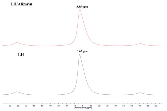 Further analysis of the structure of the organic-inorganic framework was conducted using 27Al MAS NMR. 27Al resonance line positions are very sensitive to the coordination number and tend to occupy the −5 to 15 ppm range for AlO6 sites [26]. Figure 2 shows the spectrum of LH recorded before and after the adsorption of the anthraquinone dye. The resonance corresponding to hexacoordinated aluminum is clearly visible. The 27Al MAS spectrum of the LH sample before complexation shows a relatively narrow resonance peak at a chemical shift, δ, of ~3.6 ppm. The NMR signal of the hybrid pigment was different from that of the unmodified LH sample. Adding the organic chromophore to the LH host contributed to a chemical shift of the resonance peak from 3.6 to 3.9 ppm, which is very close to the chemical shift measured (3.4 to 3.2 ppm) for montmorillonite modified with alizarin in a reaction carried out under similar pH conditions (8.4) [21]. The results of NMR and TOF-SIMS provided complementary evidence of the interaction between the Al3+ ions and dye molecules.