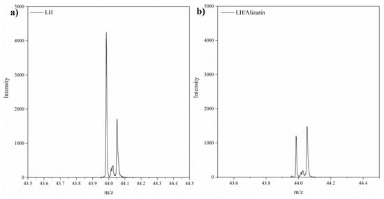 Figure 3. TOF-SIMS spectra of negative secondary CO2 ions in LH (a) and LH/Alizarin (10%) (b).