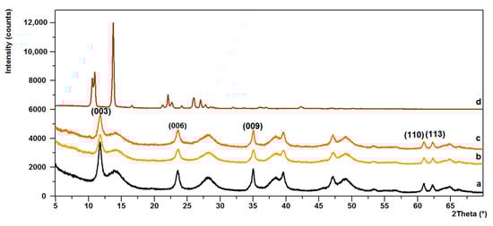 Further structural analysis revealed that no changes had taken place in the basal spacing of the LH, following the arrangements of the alizarin dye in the mineral structure. The diffraction pattern of LH shown in Figure 4a consists of three sharp peaks at a low 2θ angle, equivalent to diffraction by planes (003), (006), and (009), respectively. This indicates the good crystallinity of the LH. The interlayer distances of (d003) and (d006), corresponding to 0.753 nm and 0.378 nm, are due to basal reflections indexed to a hexagonal crystal lattice with rhombohedral 3R symmetry [28]. Broadened peaks are observed on the diffraction pattern of the LH, which could be due to unaccounted for, poorly crystalline impurities. After the addition of alizarin, the basal reflection (003) of the LH/Alizarin pigments (Figure 4b,c) shifted slightly to lower 2θ angles, which for LH20, was 11.733° and for LH/Alizarine (20%), was 11.504°, although the interlayer distances remained similar, regardless of the content of dye molecules. The presence of a characteristic non-basal (110) reflection at 2θ ~60.90° confirms that the LH structure had been retained. The PXRD pattern for LH/Alizarin (20%) (Figure 4c) also shows very small reflections, characteristic of the crystalline structure of alizarin.