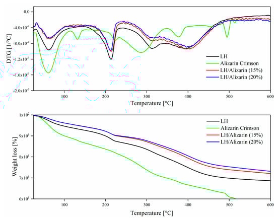 Thermogravimetric analysis (TG/DTG) was used to determine the thermal stability of the pigments. As shown in Figure 5, the thermal stability of the hybrid pigments improved significantly in comparison to the commercial alizarin lake and raw LH. The DTG curves of the hybrid pigments display multistep decomposition behavior typical of mixed oxides. The first stage below 100 °C corresponds partly to the desorption of water physisorbed on the external surface of LH, and partly to the removal of water molecules from the interlayer galleries. The second weight loss on the DTG curve with a strong peak centered at 213 °C can be attributed to the water produced by dehydroxylation of the LH layers. The final weight loss step occurs as the temperature increases, with two peaks at around 313 °C and 393 °C. The peaks can be attributed to the loss of interlayer carbonates and to the complete decomposition of metal hydroxide layers, respectively. It was during this stage that metal oxide structures formed [29]. The absence of a TG-DTG peak for the dye chromophore can be explained by the similar position of the dye degradation peak (326 °C) and the carbonate decomposition peak of the inorganic LH. However, the TG-DTG curve for Alizarin Crimson was shaped differently. Weight loss was observed at low temperatures (<200 °C), probably as a result of water loss. Above 200 °C, slow degradation was observed. The weight loss in the temperature range of 200–500 °C may be attributed to the degradation of the organic moiety.
