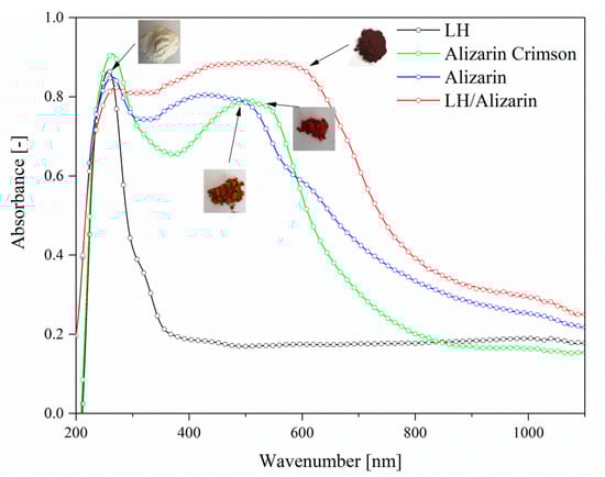 Figure 6 shows the absorption spectra for different LH, alizarin, Alizarin Crimson, and LH-based alizarin lake powders. The absorption spectrum of the alizarin chromophore shows a structured band with a maximum at 459 nm. The UV-Vis spectrum of the alizarin lake has a λmax at 571 nm, with a significant bathochromic shift in comparison to free dye, due to complexation of the magnesium (II) and aluminum (III) ions into the LH layers. The variations in the color and hue of alizarin are pH-dependent (Figure 6) [21]. Neutral free alizarin can exist in several tautomeric forms. In solution, alizarin occurs in the form of partially dissociated yellow molecules below pH 5.2. At pH 6–10, it is deprotonated and occurs in red monovalent cations. Finally, at around pH 12, it occurs in violet di-anionic form. At low pH, the interactions between the organic dyes and the clay surface are generally driven by electrostatic forces. At a higher pH (such as in our study), interactions can occur via the complexation of chromophore structures with the metal cations present in the LH layers.
