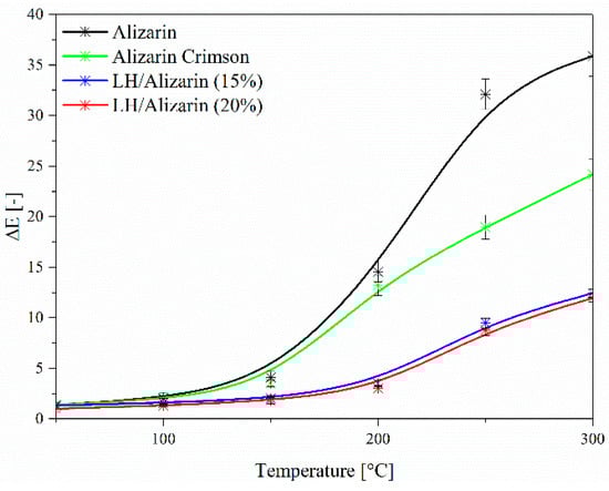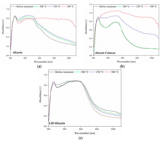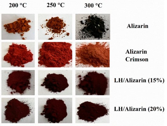 Some slight change in the color of the lake pigments was observed after 250 °C, resulting from the dehydroxylation of the LH layers. These results show that the alizarin lake can tolerate higher temperatures than pure chromophore or the commercial lake (Alizarin Crimson). The ΔE values for alizarin and Alizarin Crimson were larger than those of the LH-based lake after thermal aging above 200 °C, confirming that the LH/Alizarin pigments had a higher thermal stability than the reference samples. It can be concluded that the incorporation of alizarin dye into the LH structure significantly improved the thermal stability of the organic chromophore. This observation was confirmed by the diffuse reflectance UV-vis spectra of the studied pigments (Figure 9). The spectra of the dye and commercial lake showed marked changes after heating at 300 °C. However, in the case of alizarin pigments, there were no significant changes in the spectra after exposition at any of the considered temperatures.