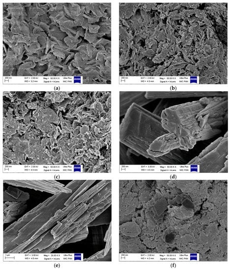 Figure 10. SEM images of LH (a); LH/Alizarin (15%) (b); LH/Alizarin (20%) (c); alizarin crystals (d,e); and Alizarin Crimson (f).