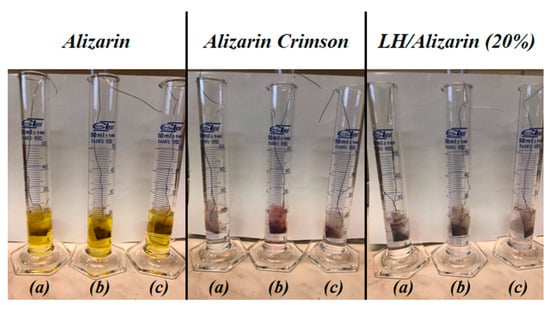 Figure 11. Digital images of alizarin, Alizarin Crimson, and alizarin pigments after 24 h of immersion in toluene (a), acetone (b), and ethyl alcohol (c).