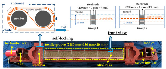 The manufacturing process started with all textiles tautly positioned on the groove (2180 mm × 150 mm × 20 mm) of the tensioning system (Figure 2), i.e., one layer of textile was positioned at the middle height of the specimen or two layers of textiles were placed uniformly along the height of the specimen. Two groups of overlapping steel rods (thicknesses of 3, 5, 7 mm) were used to determine the location of the textile layers and the thickness of the specimens (Figure 2). Note that the global thickness of all specimens was set to 15 mm.