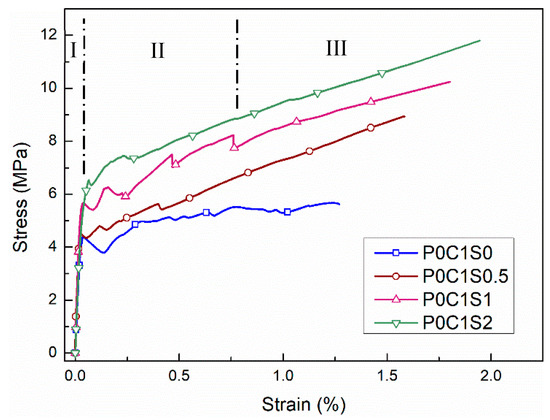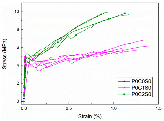Stress–strain curves of the test specimens: P0C0S0, P0C1S0, and P0C2S0.