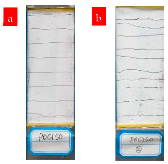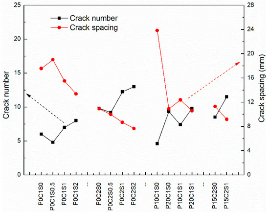 The cracking patterns of P0C1S0 and P0C2S0 after uniaxial tensile tests are shown in Figure 9. Compared with the plain matrix, Figure 9 indicates that the TRM specimens possessed a uniform distribution of fine cracks. The increase in reinforcement ratios also affected the crack patterns. As shown in Figure 10 and Table 4, the number of cracks increased from 6 to 9.8 as the reinforcement ratio increased from 0.4% to 0.8%, accompanied by a reduction in the distances between cracks and the crack widths. Based on Figure 7 and Figure 8, the cracking mechanisms of P0C1S0 and P0C2S0 under tensile loading can be described as follows. (i) The first crack formed in the TRM composites when the tensile stress of the specimens reached the tensile strength of the cementitious matrix. (ii) The load originally carried by the matrix was transferred to the carbon textiles located in the crack. (iii) The bond strength between the matrix and textile allowed the textiles to transfer the load to the uncracked matrix located at either side of the crack. (iv) A new crack formed in the TRM when the stress in the uncracked matrix reached its tensile strength. (v) The stress constantly transferred between the textiles and the uncracked matrix and a multi-cracking pattern formed. (vi) No sequent cracks formed in the specimens when the interfacial bond property was so poor that the stress could not be transferred. (vii) Finally, the specimens suffered debonding failure.