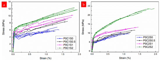 Figure 7 shows the stress–strain curves that were obtained from the tensile tests for specimens P0C0S0, P0C1S0, and P0C2S0. The stress–strain behavior of P0C0S0 is linear-elastic before reaching the ultimate stress. The stress then drops to zero after the brittle failure, indicating that only one crack forms in this specimen. Nevertheless, for P0C1S0 and P0C2S0, the stress increases approximately linearly with the strain until the first crack appears in the TRM specimens. An apparent drop of tensile stress occurs after reaching the first-crack stress in both P0C1S0 and P0C2S0 and then the stress continues to increase until dropping again upon the formation of a new crack. This procedure is repeated until the ultimate stress is reached, at which point the specimens fail completely.