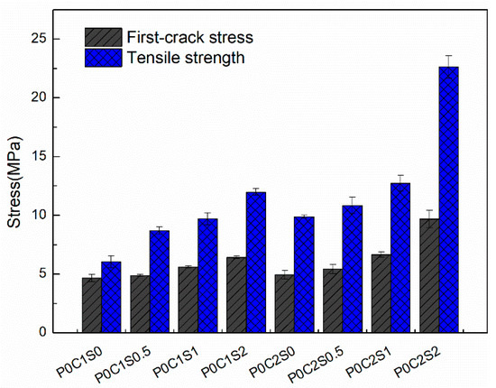 From the experimental results, it can be inferred that short steel fibers distributed randomly in the grids of the textiles as secondary reinforcement improve the bond strength between the textiles and the matrix. The excellent bond strength is mainly attributable to the “shear resistant ability” of the steel fibers inserted vertically or obliquely into the grids of the textiles. Adding steel fibers to TRM could improve the cracking resistance of the matrix and further enhance the bearing capacity of the composites. These improved mechanical properties are characterized by a higher first-crack stress, smaller reduction in stiffness after cracking, smaller fluctuations in the stress–strain curves, and higher ultimate tensile strength compared with the specimens without steel fibers (Figure 11).