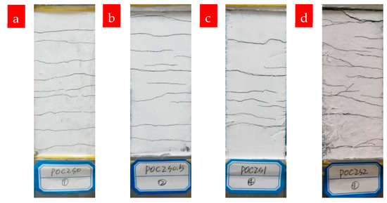 Cracking in TRM specimens with different volume fractions of steel fibers: (a) P0C2S0, (b) P0C2S0.5, (c) P0C2S1, and (d) P0C2S2.