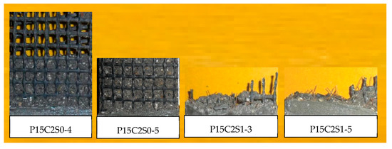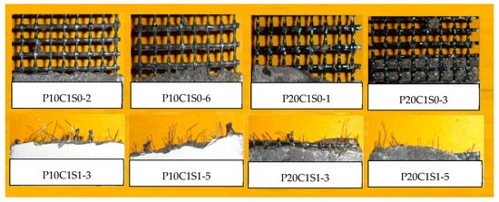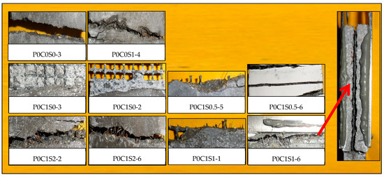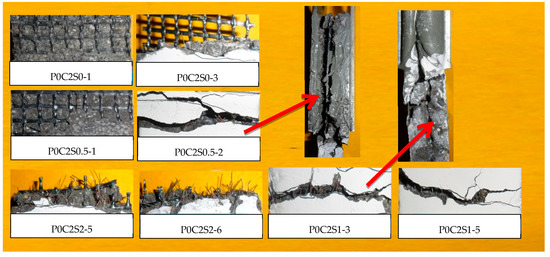 The fracture surfaces of TRM specimens with steel fibers are shown in Figure 14 and Figure 15. For both P0C1S1and P0C2S1, only a small number of specimens failed because of the complete fracture of carbon textiles. Most of the specimens still exhibited debonding failure. With the increase in the steel fiber proportions in the TRM, the failure mode of both P0C1S2 and P0C2S2 transformed into a complete fracture of carbon textiles, i.e., a high utilization rate of carbon textiles was achieved. Adding 2% steel fibers to the TRM composites can be regarded as an effective means of enhancing the textile–matrix bond property. Additionally, it can be seen in Figure 10 that P0C2S2 had the maximum crack number as well as the minimum crack spacing among all the specimens. P0C2S2 had an average of 13 cracks and an average crack spacing of 7.66 mm.