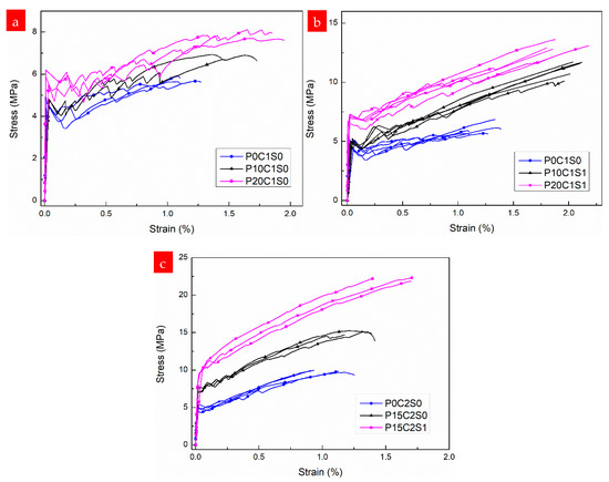 Stress–strain curves of the prestressed TRM specimens: (a) reinforced with one-layer textile and without steel fibers, (b) reinforced with one-layer textile and 1.0% steel fibers, and (c) reinforced with two-layer textiles.