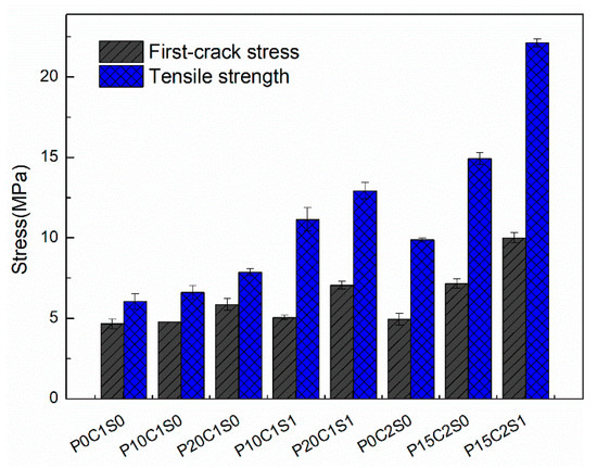 Figure 18 presents the stress–strain curves of the prestressed TRM specimens. The results, including a summary of the tensile strength, ultimate strain, first-crack stress, crack number, crack spacing, and EF values are listed in Table 4. The first-crack stress and tensile strength of the prestressed TRM specimens are depicted in Figure 19. According to the results shown in Figure 18a, pre-tension to 10% and 20% of the ultimate tensile capacity of the one-layer textile increased the specimens’ first-crack stress. Although both the first-crack stress and tensile strength improved with increases in the prestress level, the improvements are not obvious (Figure 19). For example, the first-crack stress and ultimate tensile strength of P20C1S0 only increased by 25.7% and 30.5%, respectively, compared with those in P0C1S0. Figure 18b shows that adding 1% steel fibers to the prestressed TRM specimens improves their mechanical properties. The first-crack stress, ultimate tensile strength, and strain capacity of P20C1S1 increased by 51.5%, 114%, and 57.4%, respectively, compared with those in the reference specimen P0C1S0.
