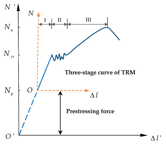 The effect of prestress can be explained by referring to Figure 20. Point is the origin of the tension force with respect to displacement . The curve includes three distinctive stages, i.e., elastic, multiple cracking, and post-cracking. In this case, indicates the critical tensile load at which the mortar matrix first cracks, corresponding to the moment that the tensile load is mostly transferred to the textiles, whereas is the ultimate tensile load, beyond which the specimen loses its load capacity. Whether the slope of the post-cracking stage is steeper or shallower than that in stage I depends on the stiffness of the reinforcing textiles. Once the textiles in the TRM specimen are pre-tensioned, the origin shifts to point , permitting the previous short uncracked stage to extend to an ideal duration [26]. With respect to this particular curve, a prestressing force is exerted on the textiles at point and released at point . Thus, an initial compressive stress on the concrete matrix was achieved, leading to an increase in the first-crack stress [35]. Moreover, after releasing the prestress on the mortar matrix, the bond strength between the textile and matrix is considerably improved, so the ultimate tensile strength of the TRM specimens also increases (Figure 18 and Figure 19). The development process after releasing the prestress in TRM specimens runs along the same path as the un-prestressed specimens until the final failure. As a result, exerting a prestressing force on the textiles extends the serviceability limit states of TRM and produces more reliable workability.