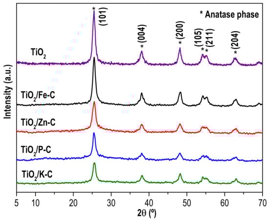The XRD diffractograms of the TiO2/x-C heterostructures synthesized are depicted in Figure 1 together with that of the TiO2 prepared as reference. All the samples show the characteristic peaks of the anatase phase (JCPDS file No. 78-2486), whose (hkl) planes are marked in the Figure 1. No peaks assigned to other crystal phases of TiO2 (e.g., rutile and brookite) or other from the AC were detected. That was also the situation with TiO2/C heterostructures synthesized by a similar procedure using glucose as carbon precursor [29]. Thus, solvothermal synthesis at 160 °C allowed the development of the crystalline structure of titania without the need of further heat treatment. Comparing the diffractograms, the most intense peak of anatase (101) differs in width depending of the samples. Usually, the widening of the diffraction peaks is associated with the reduction of the crystal size and the creation of defects in the crystalline structure. The anatase crystal size (D) was calculated by using the Scherrer’s equation and the position and width of the (101) peak. The values are collected in Table 2. The bare TiO2 prepared by this solvothermal treatment exhibits a small crystal size, lower than that reported for anatase TiO2 prepared by other methods [35]. In the TiO2/x-C samples, even smaller TiO2 crystal sizes are observed, the values depending on the nature of the activating agent used to prepare the AC. The lowest anatase crystal size was obtained with Zn-C. These values are analogous to those reported for other TiO2/AC hybrids prepared by the sol-gel method that required a calcination step in air [36,37]. The amount of TiO2 incorporated in the heterostructures was determined by WDXRF and the results are included in Table 2. Most of the samples have a TiO2 content similar to the expected (80%), with only the sample TiO2/Zn-C showing some significant deviation. Additional samples were prepared by decreasing the percentage of TiO2, but the results obtained in terms of photocatalytic activity for ACE degradation were considerably poorer and thus, those samples were discarded.