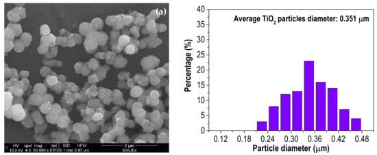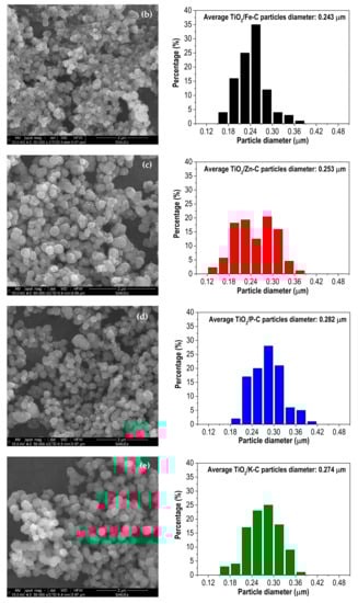 SEM images and particle size distribution of: (a) TiO2; (b) TiO2/Fe-C; (c) TiO2/Zn-C; (d) TiO2/P-C; (e) TiO2/K-C.