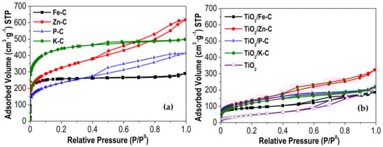 Nitrogen adsorption–desorption isotherms of activated carbons and TiO2/x-C heterostructures are represented in Figure 3. K-C and Fe-C ACs (Figure 3a) show typical type I isotherms, characteristic of microporous materials, according to the IUPAC classification [39]. In both cases, the major uptake occurs at low relative pressures followed by an almost horizontal branch, this shape being indicative of highly microporous solids. In contrast, Zn-C and P-C describe hybrid I/II type isotherms with hysteresis loops at P/P0 > 0.4, suggesting the existence of a well-developed microporous structure but with significant contribution of mesoporosity. Figure 3b shows that the different TiO2/x-C heterostructures present type II isotherms, with a remarkable decrease of adsorption, indicating that the porous structure of the activated carbons has been partially blocked by the incorporation of TiO2.