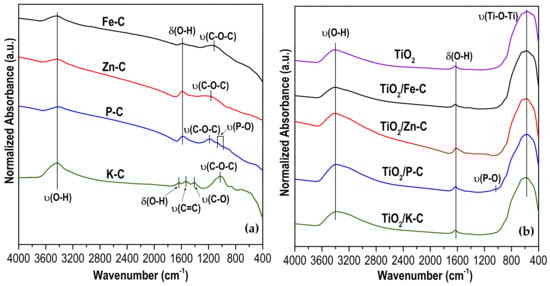 The surface functional groups of all activated carbons and synthesized heterostructures were assessed from the FTIR spectra (Figure 4). The activated carbons (Figure 4a) show the characteristic bands due to the presence of adsorbed water, appearing the –OH stretching and bending bands at 3400 and 1600 cm−1, respectively [29,43,44]. In the K-C carbon, the peaks located at 1537 and 1408 cm−1 were assigned to the stretching of –C=C in the skeletal aromatic ring and –CO stretching of carbonate groups, respectively [43,45,46]. Stretching of –COC can be observed in the absorption bands centered in the range of 1170–1030 cm−1. This vibration can be produced from diverse oxygenated groups, thus varying the main absorption peak [29,43]. In P-C, the weak bands centered at 1060 and 980 cm−1 can be attributed to –PO and –POC groups. TiO2 and TiO2/x-C FTIR spectra (Figure 4b), are very similar among them, indicating the homogeneous distribution of TiO2 over the heterostructure. There are three main absorption bands. Those centered at 3400 and 1625 cm−1 are associated with adsorbed water, as previously indicated for activated carbons. The wide band located between 800 and 400 cm−1 corresponds to the characteristic –Ti-O-Ti stretching band of TiO2 [47,48]. This band appears in all samples, with a maximum ca. to 700 cm−1, which corroborates the generation of titania phase in all the heterostructures. The high intensity and width of this band overlaps those characteristic bands described for the activated carbons, taking into account that the TiO2 percentage of these heterostructures is fairly high (ca. 80%). In the case of TiO2/P–C, around 1030 cm−1 appears a weak shoulder that can be ascribed to the stretching bands of –PO and –POC groups previously described for the corresponding activated carbon.