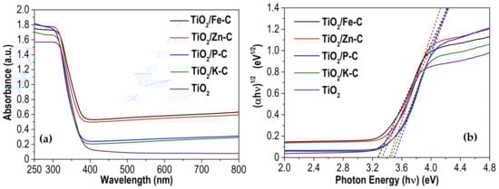 The light absorption in the UV and visible region of the synthesized photocatalysts was investigated by UV-vis DRS technique, the resulting spectra are shown in Figure 5a. The absorption band observed in the UV range (below 360 nm) is very similar in all cases, typical of TiO2. In the visible region, the spectra of the heterostructures do not fall to zero because of their grey color. The effect is more evident in TiO2/Fe-C and TiO2/Zn-C, because these samples have lower percentages of TiO2 (Table 2), yielding the color change from light-to-dark grey. As mentioned above, the band gap values were determined from the UV-vis DRS spectra (according to the Tauc plot method, Figure 5b) and are included in Table 2. The values are fairly similar to that of TiO2 [51,52], only somewhat higher except in the case of TiO2/Fe-C. Although it has been reported that the combination of TiO2 with carbonaceous supports can produce a significant red-shifted displacement of absorption edge, in our heterostructures this has not been observed. This may be due to a more limited interaction between TiO2 and AC compared to other carbon supports, like graphene or carbon nanotubes [11,12].