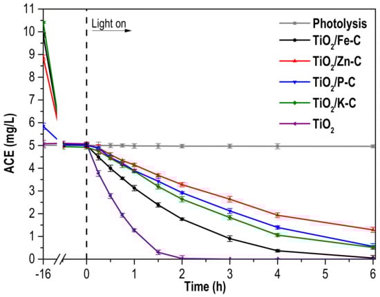 It can also be seen in Figure 6 that bare TiO2 exhibits better photocatalytic performance than the synthesized TiO2/x-C heterostructures, which is consistent with the easier accessibility of TiO2 [11], but also with the higher opacity of the suspension caused by the black-grey color. Furthermore, the higher concentration of the heterostructures contributes to their poorer behavior (all the tests were performed with the same amount of TiO2, and therefore, the amount of solid in the suspension is higher with the TiO2/x-C heterostructures). Regarding the photocatalytic performance of the synthesized heterostructures, TiO2/Fe-C appears as the most active, allowing complete ACE conversion after 6 h of reaction, probably due to the lowest band gap of this photocatalyst. The reduction of the photocatalytic activity of TiO2/activated carbon heterostructures with respect to bare TiO2 has been previously reported [54,55]. However, other publications claimed the opposite behavior, where the highest photocatalytic activity was found for TiO2/activated carbon materials [29,56,57]. In some of these works, dark-adsorption was extended for no more than 1 h, which was not probably enough for the complete adsorption equilibrium. Therefore, when the photocatalytic tests started, a combination between adsorption and photocatalytic reaction was carried out. In this sense, the current work focuses only in the photocatalytic performance of the synthesized heterostructures, after reaching adsorption equilibrium.