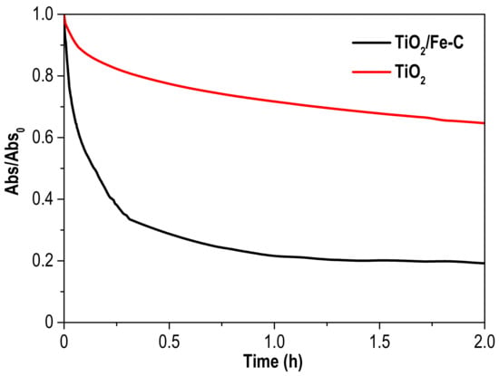 Absorbance evolution profiles (600 nm) during settling test of TiO2/Fe-C and TiO2 photocatalysts.