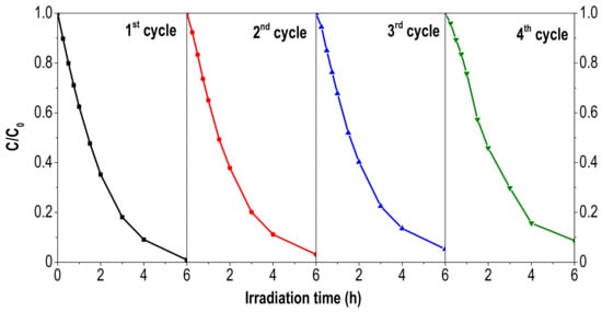 The stability of the photocatalyst with the best recoverability was investigated upon four consecutive cycles. After each cycle, the used TiO2/Fe-C was filtered, washed with deionized water and dried at 60 °C overnight. Each new cycle was carried out with identical conditions as previously described for the degradation of ACE (Figure 6). As depicted in Figure 8, the heterostructure showed a good performance in the photocatalytic oxidation of ACE after four successive cycles with a slight decrease in the final conversion (92% removal after 6 h of irradiation). The porous texture of the used photocatalyst was also analysed (Figure 9), showing a decrease of the porous network, probably due to the partial blocking of the microporous structure by the adsorbed contaminant or even the oxidized intermediates. Furthermore, the leaching of titania was not detected in the solution after four recycles by using inductive coupled plasma methodology.