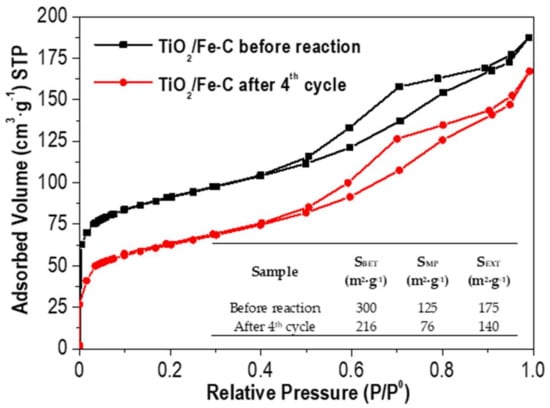 N2 adsorption-desorption isotherms (−196 °C) of TiO2/Fe-C before reaction and after four consecutive cycles. Surface area values of the photocatalyst are also included in the embedded table.